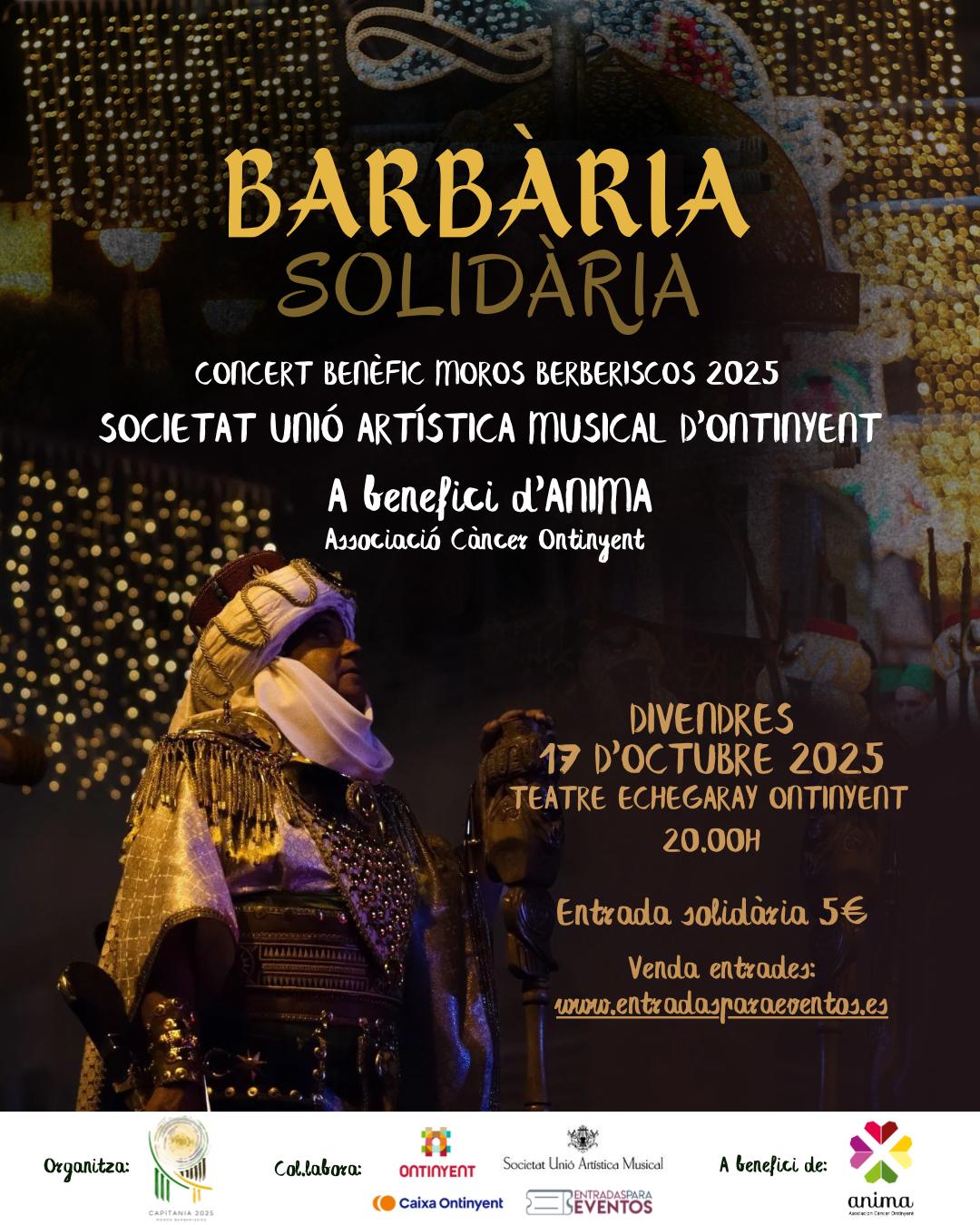 La comparsa Moros Berberiscos os invita a un evento muy especial para poner el broche de oro a su Capitanía 2025. El viernes 17 de octubre a las 20:00 h, el Teatro Echegaray de Ontinyent será el escenario de un concierto benéfico que celebra la ilusión y el trabajo de estos años.